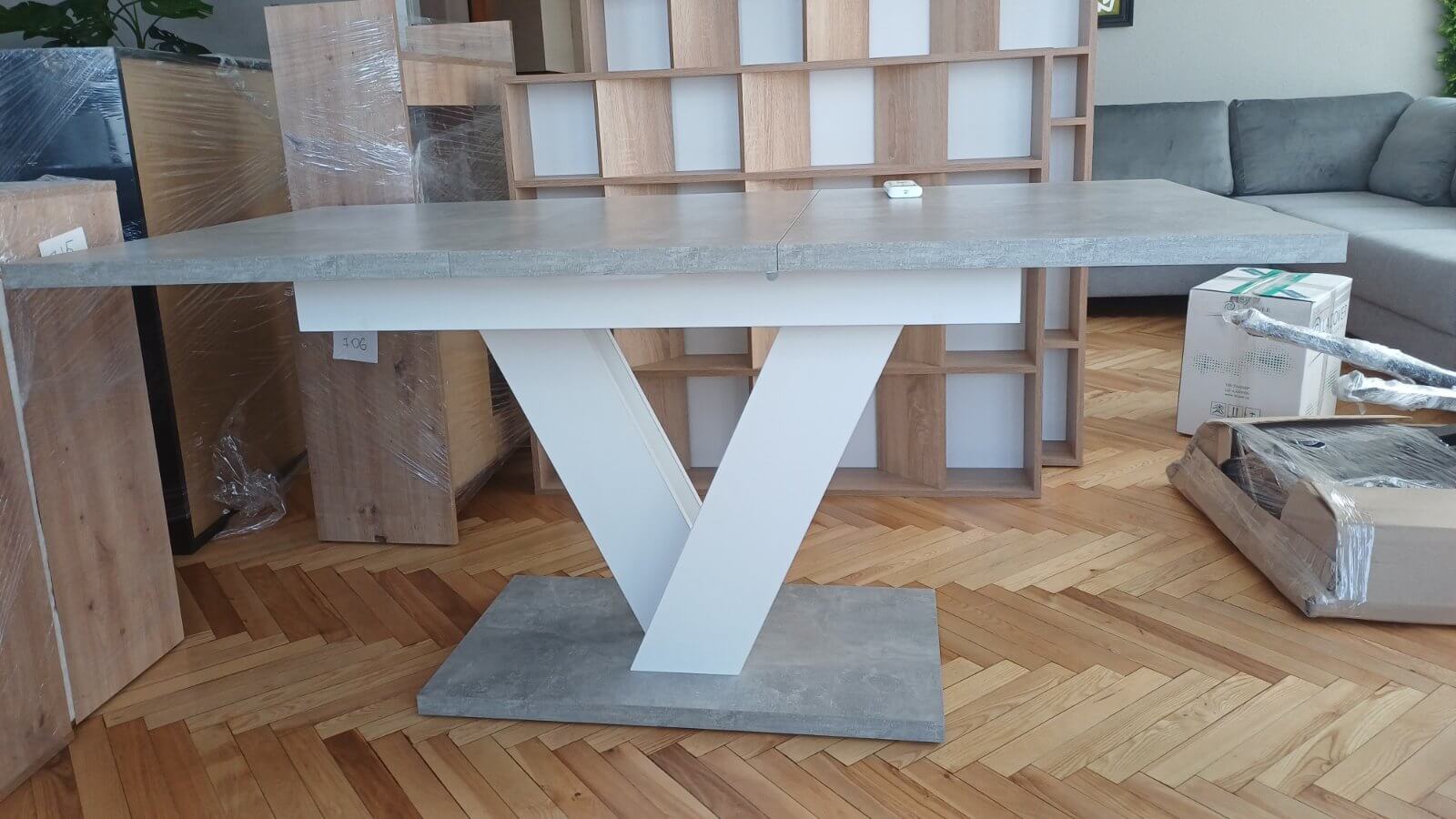 The tabletop is made of laminated chipboard (LDSB) with a thickness of 32 mm, offering high durability and resistance to daily wear. The frame and legs are crafted from MDF with a white high-gloss finish, which not only enhances the aesthetic appeal but also emphasizes the modern character of the table. The original V-shaped base ensures excellent stability and makes the table a visual focal point in the interior.